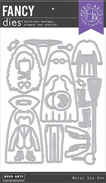 Turn your Hero Lifestyle figures into Halloween party-goers with this fun and spooky set. With 23 dies including costume pieces, footwear, and candies, this set is perfect for Halloween cards, party invitations, paper doll kits, cupcake toppers, and more. Die measurements are approximately: ghost 1.625x3.125 inch, witch hat 1.625x1.125 inch, trick or treat pumpkin 0.75x1.125 inch. Hero Arts Fancy Dies are stand-alone designs that produce beautifully detailed cut-outs on paper. Reminiscent of a Hero Arts stamp design, Fancy Dies complement stamps instead of matching them to broaden your stamping and technique options. They are made with intricate cutting surfaces from sturdy metal, are compatible with most die-cutting machines, and work well with the complete Hero Arts line of stamps and papers. Imported.