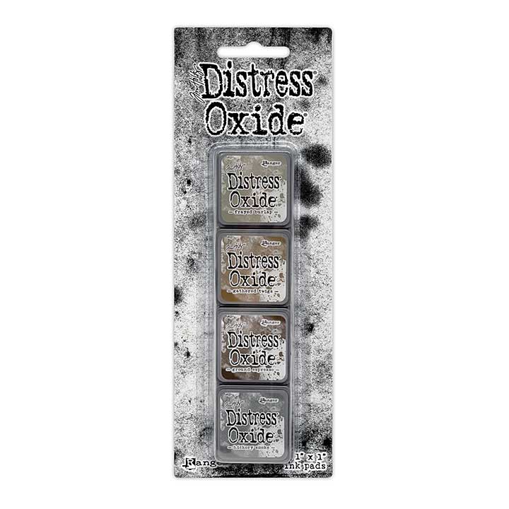 Tim Holtz Distress Mini Oxide Ink Pads are a collection of 1" x 1" cubes featuring water-reactive dye & pigment ink fusion that creates an oxidized effect when sprayed with water. Like their larger counterpart, the Mini Oxide Ink Pads have a raised felt pad with fade resistant ink that coordinates with the full Distress palette of colors. Each ink pad is stackable. Use with stamps, stencils, and direct to surface. Blend using Ink Blending Tools and Brushes. Re-ink using Distress Oxide Re-inkers. Ideal for storing in the Distress Mini Ink Storage Tin. This kit includes: Frayed Burlap, Gathered Twigs, Ground Espresso, Hickory Smoke. 4 pieces, Measurements: Case- 1 3/8"x1 3/8", Felt 1"x1".