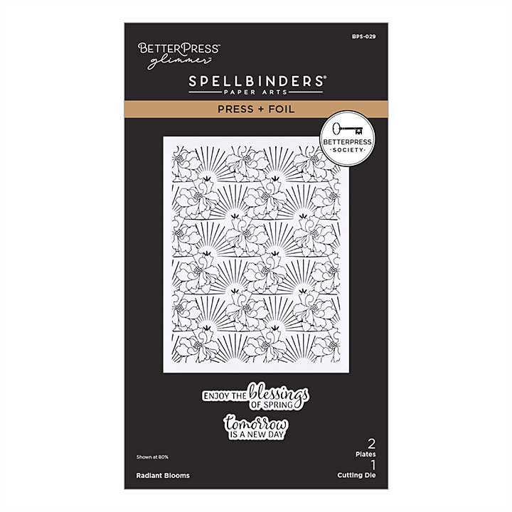 Radiant Blooms, the February plate, is gorgeous and sure to brighten someone's day. A large background plate, each press fills a full A2 card panel with rays of light and dancing lines of flowers. Two sentiments are included as a single press plate, with the phrases 'Enjoy The Blessings of Spring' and 'Tomorrow Is a New Day.' A coordinating die cuts out both sentiments in a single pass, making it easy to create multiple projects quickly.