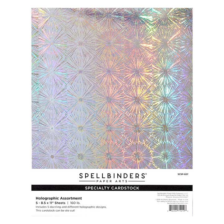 Enjoy all sorts of specialty shiny papers with this Holographic Assorted Specialty Cardstock 8 ½ x 11”! The pack of 5 premium cardstock sheets includes one sheet each of five dazzling and different holographic designs. Use this pack of specialty cardstock for your die-cutting and card layering needs. Add sparkle in your projects for scrapbooking, cardmaking and beyond! Includes five sheets of 8.50 x 11.00 in/21.60 x 37.94 cm.