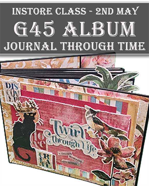 Create a stunning album using the G45 new calendar-inspired paper collection – “Journaling Through Time” along with the G45 Black Binder Album. We’ll have fun layering, tucking, and having creative play ! This collection is perfect for junk journaling, mixed media, and all your creative adventures. You are invited to twirl through life while capturing the memories that matter most.